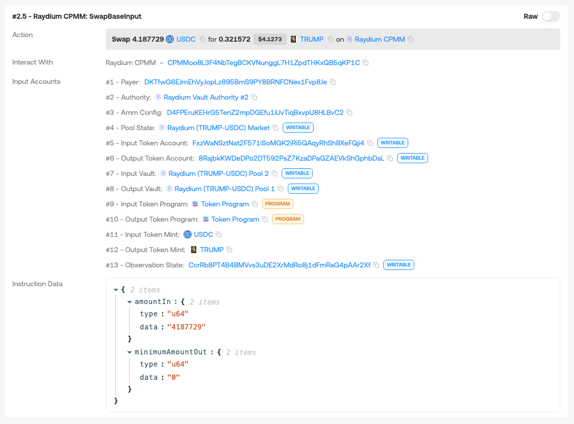 在 Input Accounts 中,我们能看到输入代币为 USDC,输出代币为 TRUMP。在 Solana 生态的 AMM 中,LP Pair 可以简单的通过 Token Account 来表示,而不需要创建一个新的合约程序并部署(例如以太坊中常用的工厂合约)。在交易发生时,直接与 Raydium 的 CPMM Program 来交互,Solana 程序将通过传入的池子地址、代币地址等来修改相应的 Token Account 的状态,来进行 swap 操作。