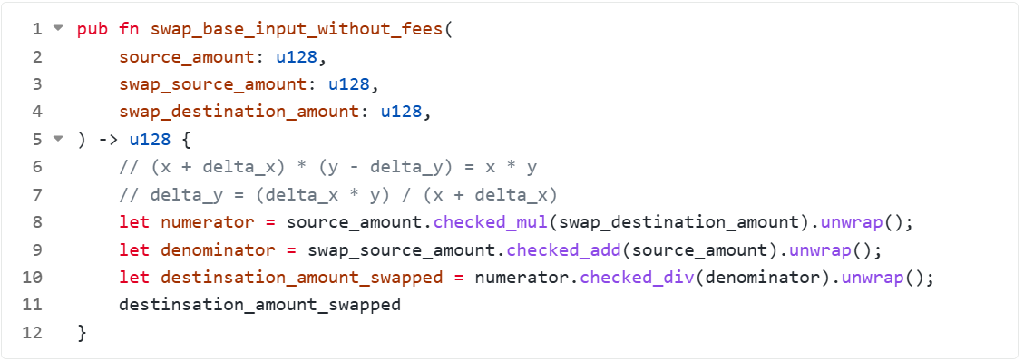 例如上述的 swapBaseInput 指令,代码在 这里 能够找到。经过一系列前置检查后,具体能够换到多少目标代币,通过 ConstantProductCurve.swap_base_input_without_fees中进行了计算: