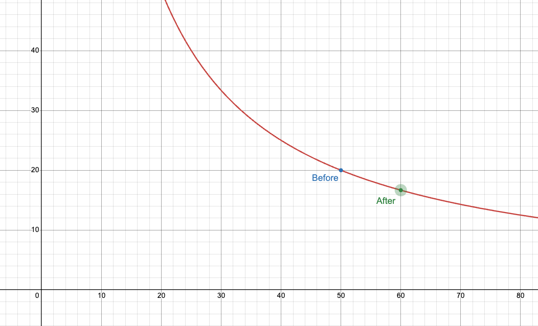 即 TokenX 和 TokenY 在总量各自变化后,其乘积应保持不便。公式左边为变化后的乘积,右边为变化前的乘积。