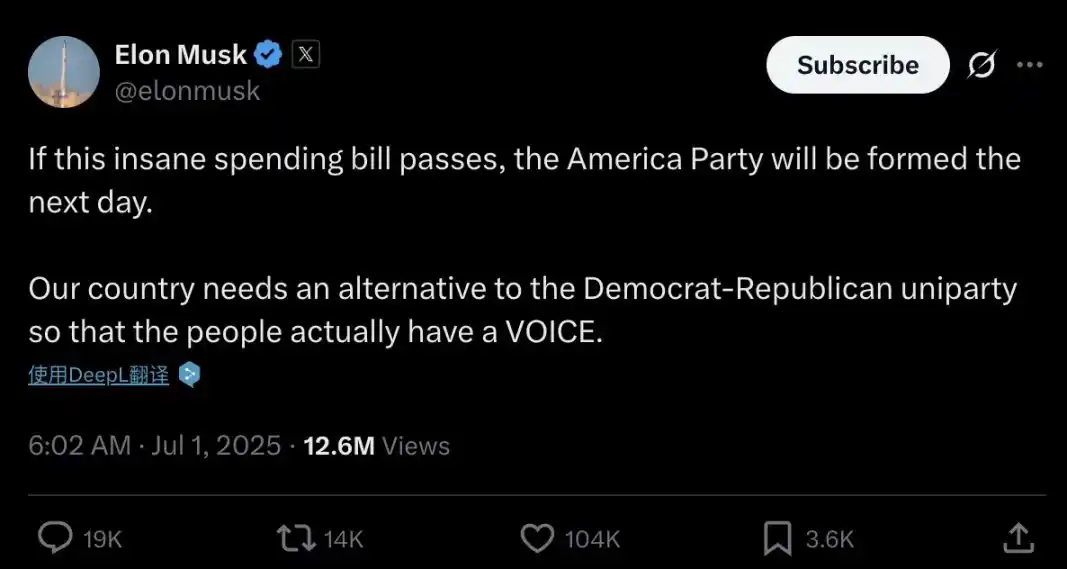 马斯克直接发推表示,「若这个疯狂的支出法案(『大而美』法案)通过,第二天就会成立美国新政党。我们的国家需要民主共和党单一政党的替代方案,以便人民真正拥有发言权。」此后,马斯克接连转发批评美国负债累累的帖子,并就民主党和共和党执政时期债务上升的事实评论道,「他们只是假装是两个政党,然而实际上只是一党。」