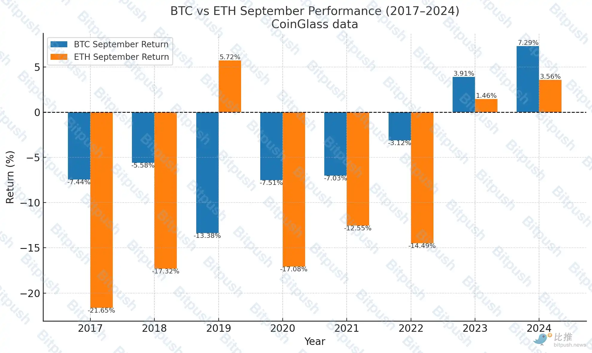 上图图表对比了 2017–2024 年 BTC 与 ETH 在九月的实际涨跌幅,可以看出: