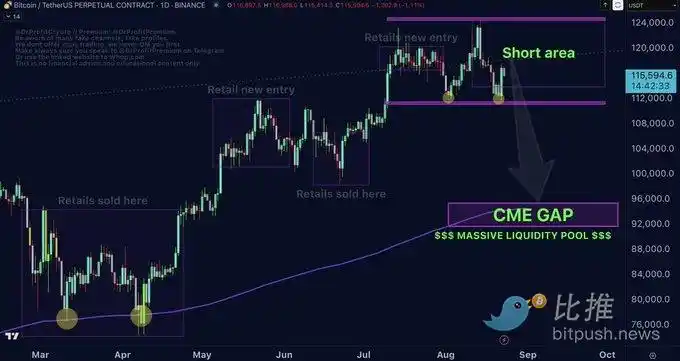在价格层面,他还强调,BTC 图表中仍存在 93k–95k 的 CME 缺口,大量流动性集中于此,而散户的建仓点位普遍在 110k–120k 区间甚至更高。若要洗出这些「弱手」,价格必须跌入他们的「最大痛点区间」。