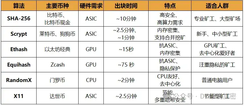 说明: 硬件需求和出块时间因网络动态可能略有变化。莱特币及达世币在早期阶段曾使用 GPU 挖矿,但最终被 ASIC 取代,GPU 基本无竞争力。