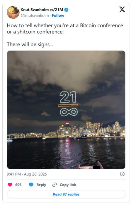 周四的无人机表演,以令人惊叹的比特币图形点亮了香港的夜空,再没有比这更能象征这一切是如何颠倒的了。它展示了一个强大的「21 除以无穷大」的符号,它是 Knut Svanholm 著名的「一切除以 2100 万」主张的直接倒置版本: